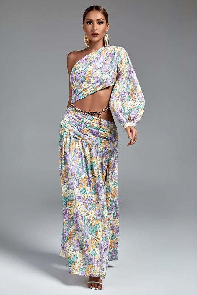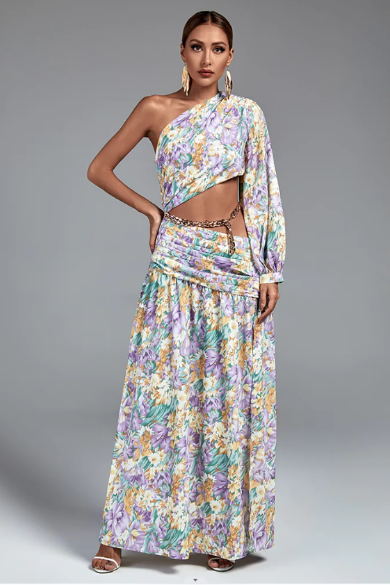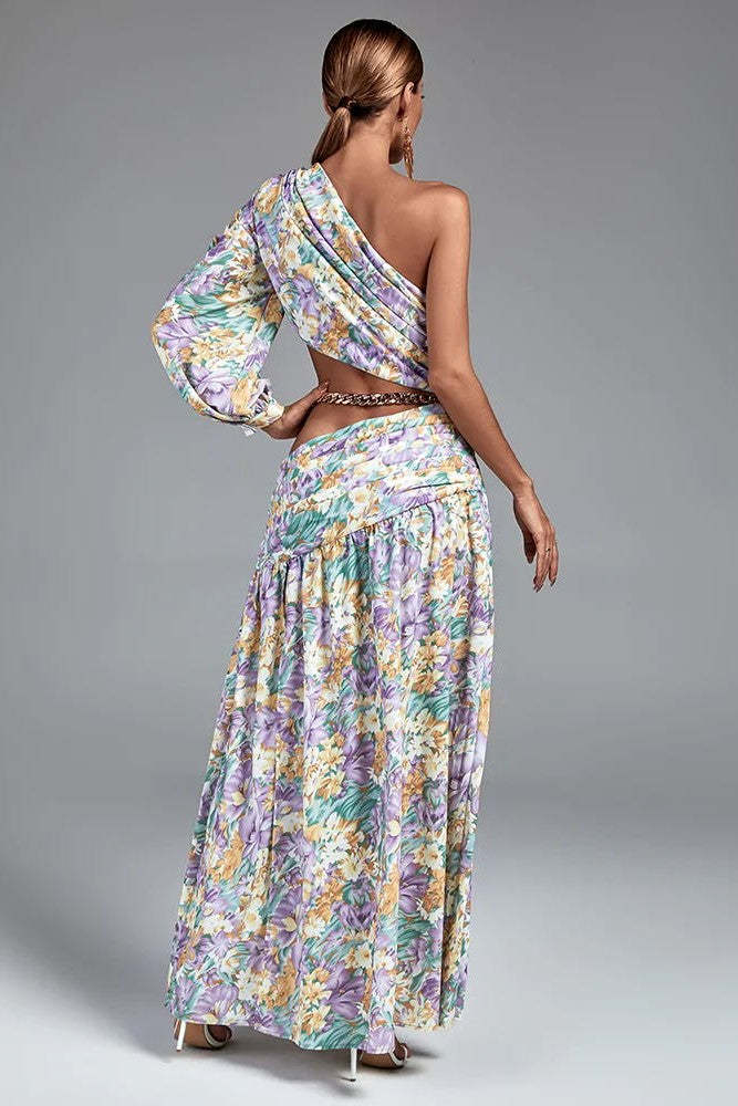 Camila Tek Omuz Çiçek Desenli Yırtmaçlı Mor Maxi Elbise