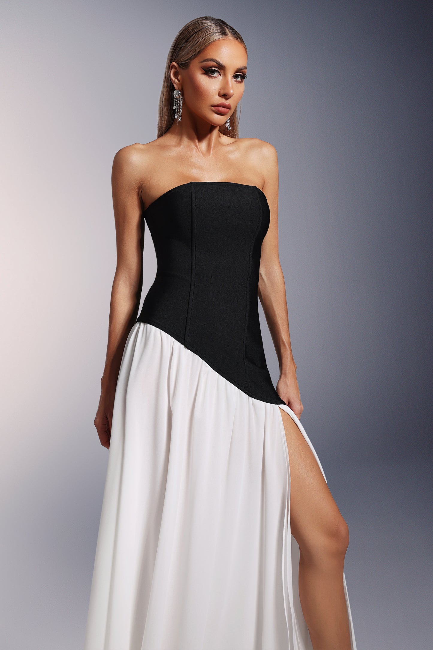 Bacak Yarıklı Straplez Bandaj Maksi Elbise